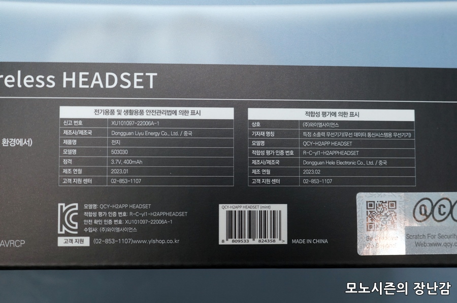 와이엘사이언스에서 정식수입하고 A/S도 해주는 제품으로 아예 박스도 한국어판 박스로 구성되어 있으며 헤드폰 외관에 QCY로고가 없어서 촌스럽지 않다는 것이 장점입니다.(직구 제품은 헤드셋 양쪽에 금색으로 QCY로고 있음)