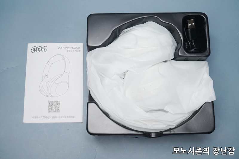 제품의 구성은 헤드폰 본체와 USB C타입의 짧은 케이블을 제공하는데 보통 QCY는 흰색 케이블을 제공하는 경우가 많은데 특이하게 검정 케이블을 제공합니다.