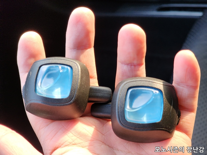 향기 세기는 위에 있는 레버로 하는데 승용차 기준으로 두개를 장착할 경우에 제일 약하게 해도 향기와 탈취력을 모두 잡을 수 있어서 그냥 제일 약하게 해놓으면 됩니다.