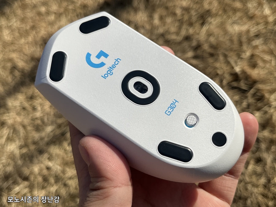 바닥면엔 logi 로고와 G304로고가 인쇄되어 있고 마우스 전원버튼이 따로 달려 있는 방식으로 마우스피트는 G102와 유사하게 되어 있는 구성입니다.