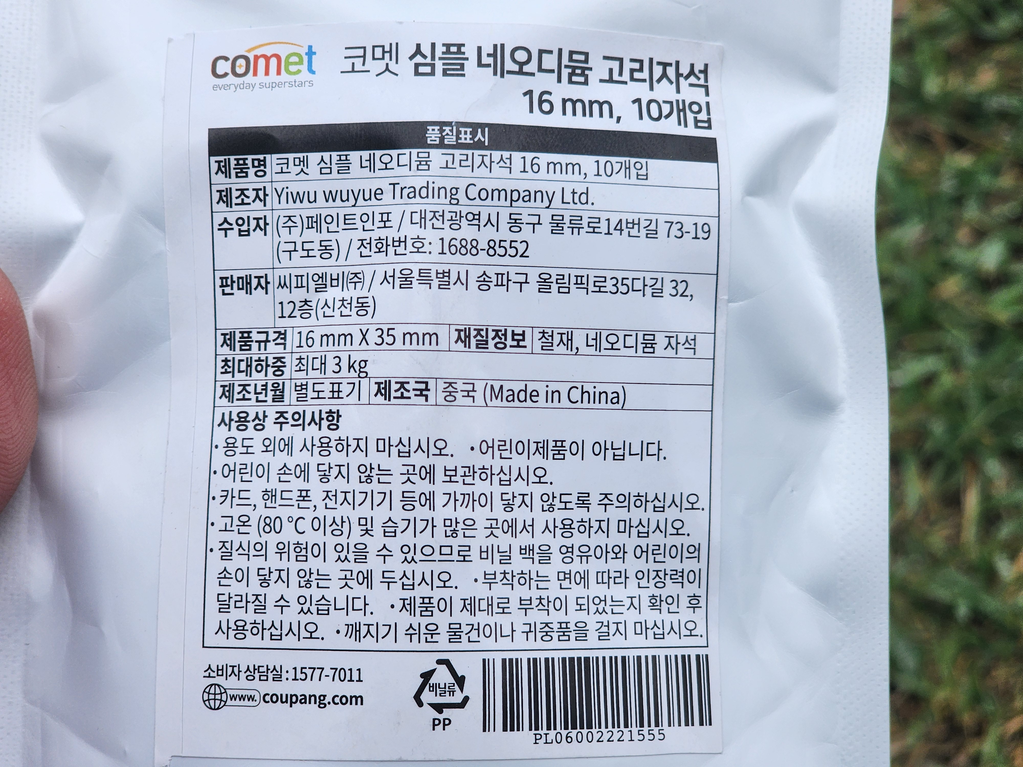 코멧 네오디뮴 고리자석 16mm에 10개입 세트를 구매했습니다.(내돈내산)