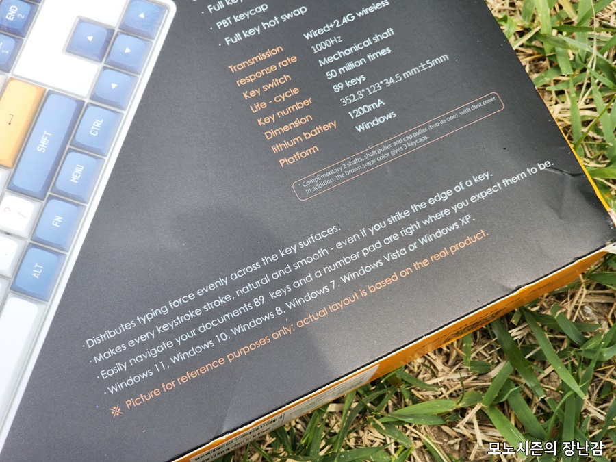 당연히 핫스왑을 지원하는 제품이고 저렴한 가격에도 PBT키캡을 사용하며 사이즈는 352.8 x 123 x 34.5mm에 배터리는 1200mAh 용량의 리튬이온 배터리가 내장된 타입으로 맥OS는 지원하지 않고 오로지 윈도우만 지원하는 제품입니다.