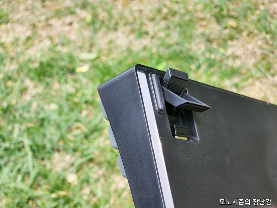 키보드 높이 받침대는 2단으로 조절할 수 있고 후면 높이 받침대 한쪽에 전용 수신기(리시버) 수납이 같이 되어 있습니다.