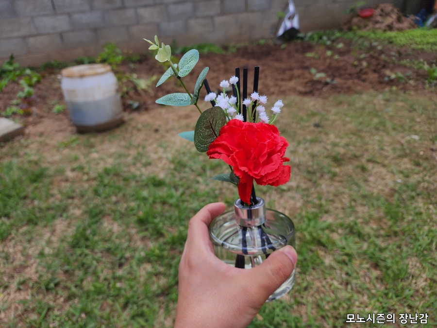 꽃으로 섬유스틱의 역활을 하는 제품도 있지만, 이 코코도르 제품은 같이 들어 있는 카네이션 조화는 그냥 장식용으로 같이 들어 있는 섬유스틱으로만 향을 발산하는 방식입니다.