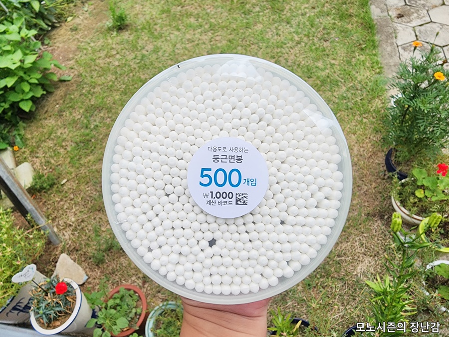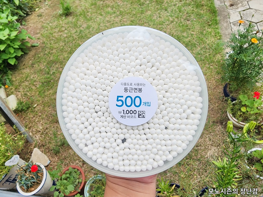 다이소에서 쓸만한 생활용품 중에는 원형 플라스틱 원통에 들어 있는 500개가 들어 있는 면봉이 있습니다.
