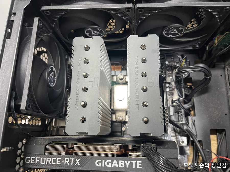 CPU교체 후에 기존에 10400F에 잘 쓰던 CPU쿨러들이 플라워형은 90도에서 100도까지 올라가고 구시대의 싱글타워나 듀얼타워 쿨러들도 피크 찍을 때에 순간 스로틀링이 걸려서 멈추는 현상이 종종 발생했고 게임하다가 멈춰서 재부팅해야 하는 경우도 있었습니다.