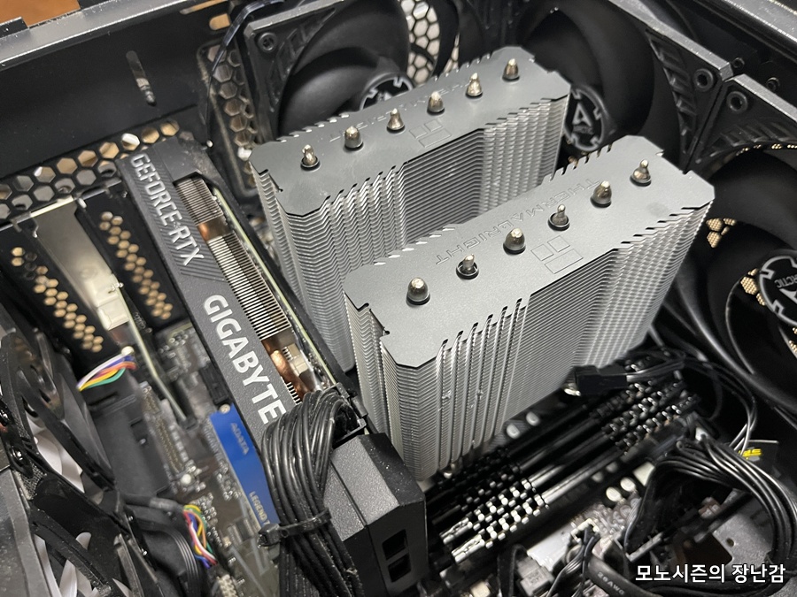 지금 사용환경은 기가바이트 M-ATX B560 메인보드로 램방열판이 달린 RAM 4개와 PCIe 4.0용 방열판이 장착된 상태로서 대장급 공랭쿨러가 간섭이 없을까 생각해서 수냉을 살려다가 얼마전에 사용하던 저렴이 수냉이 고장나버리는 바람에 수냉은 제외하고 저렴이 수냉과 비슷한 성능이 대장급 공냉으로 가능하고 가격은 비슷한 TDP에서 공냉이 더 저렴한 것이 사실이라 어쌔신 120SE면 충분하다는 결론이었습니다.