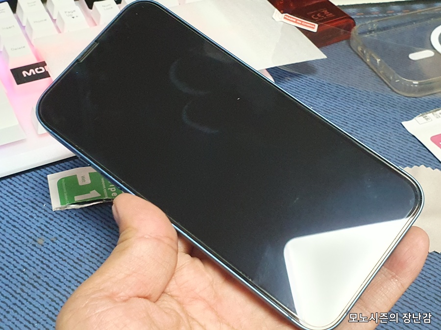 1. 핸드폰 화면 위의 이물질을 동봉된 알콜솜을 이용해 닦는다.