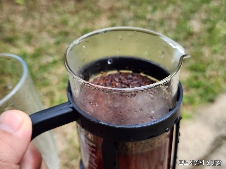 프렌치 프레스에 커피와 뜨거운 물을 넣고 불리기를 했습니다.