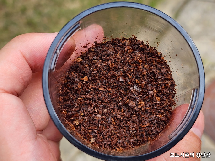 캠프쿠의 휴대용 전동 그라인더로 제일 굵게 분쇄를 해봤습니다.