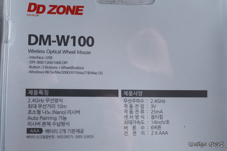 제공되는 품목은 마우스본체(DM-W100)과 KC인증 받은 AAA배터리 2개 그리고 나노리시버입니다.