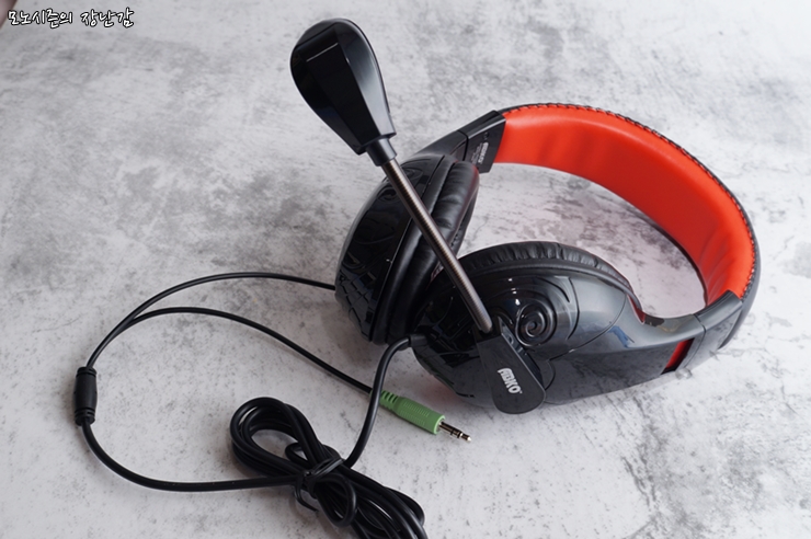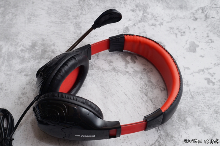 헤드셋의 머리부분은 블랙/레드색상의 쿠션감이 약간 있는 인조가죽으로 처리되어 있어서 착용감이 딱딱하지 않고 좋은 편입니다.