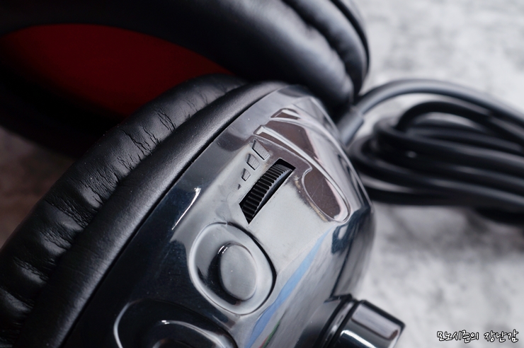 보통 컴퓨터 헤드셋의 볼륨조정은 배선에 달린 경우가 많은데 이 제품은 왼쪽귀 유닛에 볼륨보정 다이얼이 있는데, 헤드폰을 찾용했을때에 왼쪽 뒷 부분에 해당합니다.