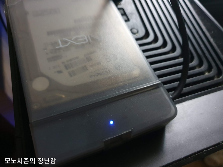 컴퓨터 USB 3.0에 연결시 위와 같이 블루 LED가 어댑터 부분에서 들어오기 때문에 동작상태를 파악할 수 있으며 케이스가 허술해보여도 하드디스크 읽는 소음자체는 잘 차단해줍니다.