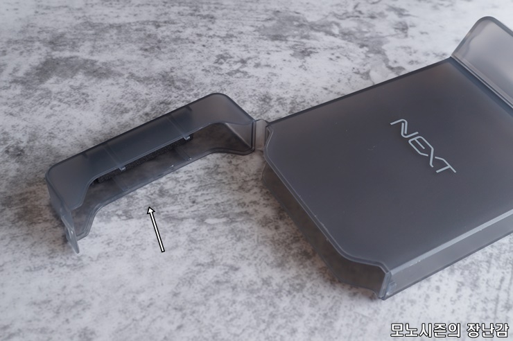 제품의 케이스는 반투명 플라스틱인데 유연한 재질이기 때문에 아무래도 충격시 파손위험이 적다는 점이 장점일 수 있겠고, 원터치 오픈 방식이고 분리형 어댑터라서 외장케이스를 사용하지 않고 어댑터만 연결해도 작동됩니다.