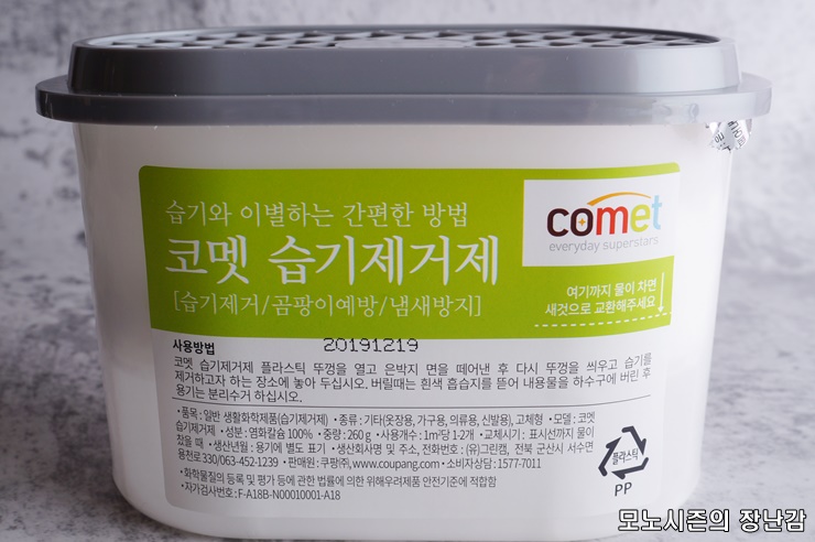 "코멧 습기제거제"로 판매하는 제품으로 comet는 쿠팡에서 만든 브랜드로서 비타할로(vitahalo)나 곰곰(gomgom)등 쿠팡 자체브랜드가 여러가지가 있습니다.