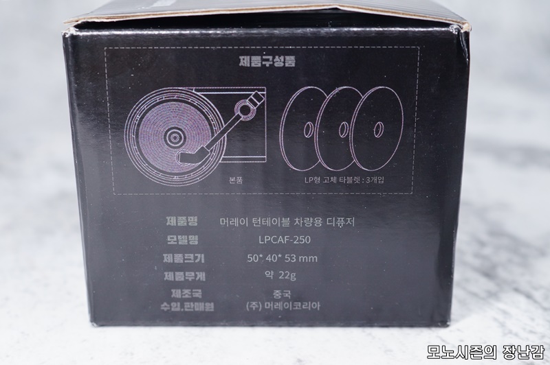 LP형 고체 타블렛 타입의 방향제를 교체해서 사용할 수 있는 제품으로 "머레이 턴테이블 차량용 디퓨져"라는 제품명으로 제품 모델명은 LPCAF-250 입니다.