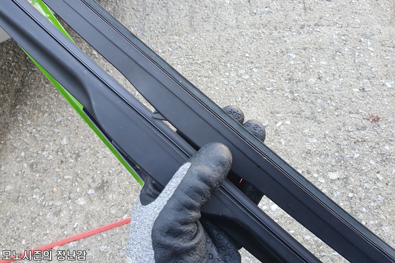 왼쪽은 새제품이고 오른쪽은 6개월 정도 사용한 제품인데, 와이퍼날의 색상과 마모의 차이가 보입니다.