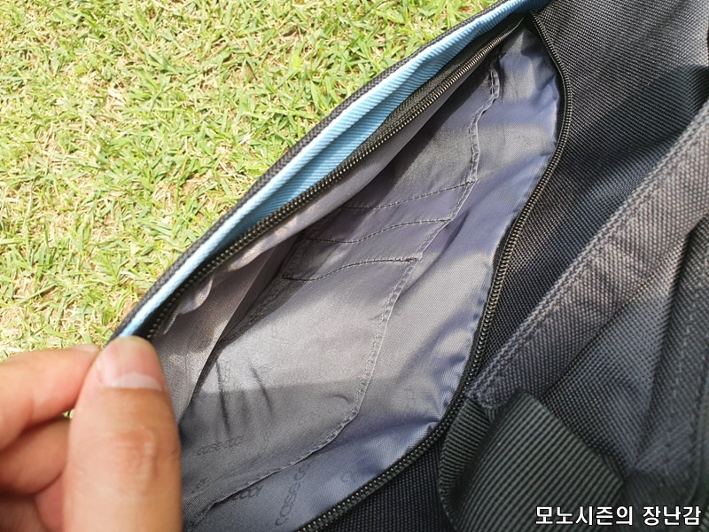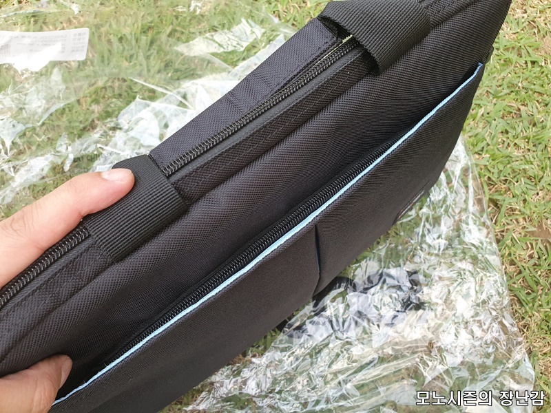 전면 가운데에 하늘색으로 포인트 들어간 것외에는 외부에 장식이 없는 심플한 외관을 가지고 있는 제품이고, 손으로 들고 다니는 것외에는 어깨끈도 있기 때문에 어깨에 걸 수는 있습니다.