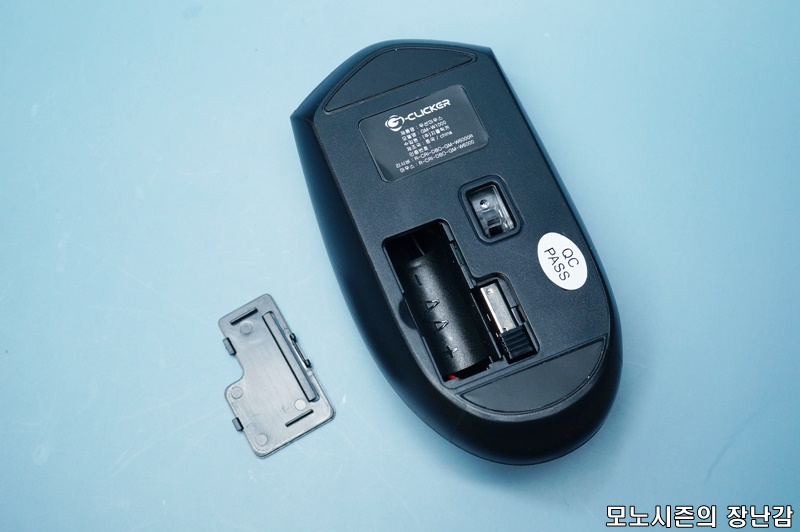 마우스 바닥면에는 건전지를 넣는 공간과 마우스센서가 있으며 마우스센서는 일반적인 레드LED를 쓰는 광마우스 방식을 사용하고 있습니다.