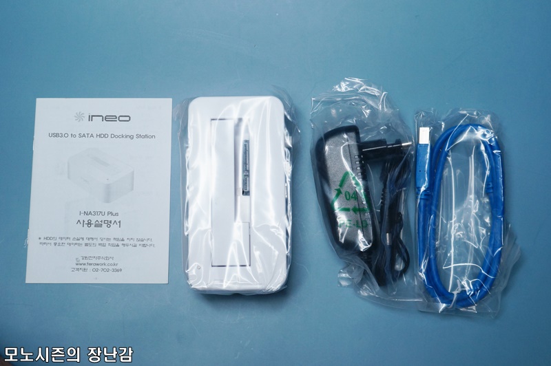 구성품은 도킹스테이션 본체와 전원 어댑터, USB 3.0 케이블, 한글 설명서가 제공되고 제공되는 케이블이 상당히 좋은 품질의 제품이 제공됩니다.