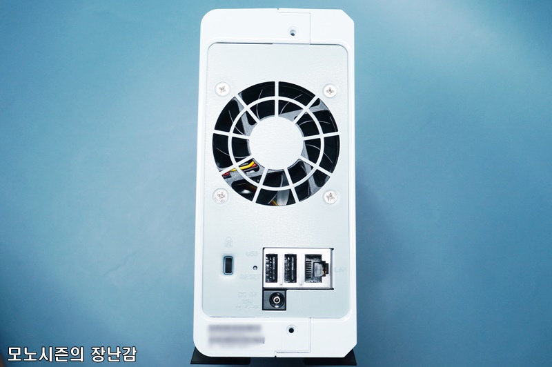 후면에는 냉각팬(DSM에서 속도조절 가능)과 캔싱턴락과 2개의 USB 2.0포트 기가랜 포트, 12볼드 전원 어댑터 포트가 위치하고 있습니다.