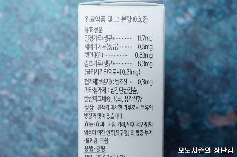 효능, 효과 : 기침, 가래, 인후[목구멍]의 염증에 의한 인후[목구멍]의 통증과 부기, 불쾌감, 목쉼