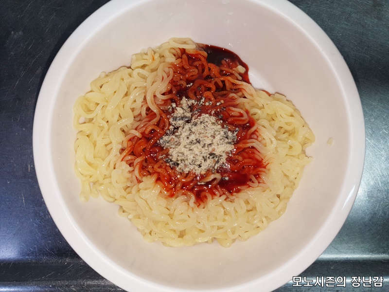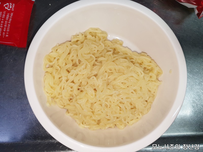 진비빔면을 삶는 방법은 다른 비빔라면과 동일하지만 면이 기존 비림라면이나 비빔면 대비해서 굵은 편이기 때문에 면을 삶는 시간이 30초 정도 더 길게 설정되어 있기 때문에 이 부분만 주의하면 됩니다.