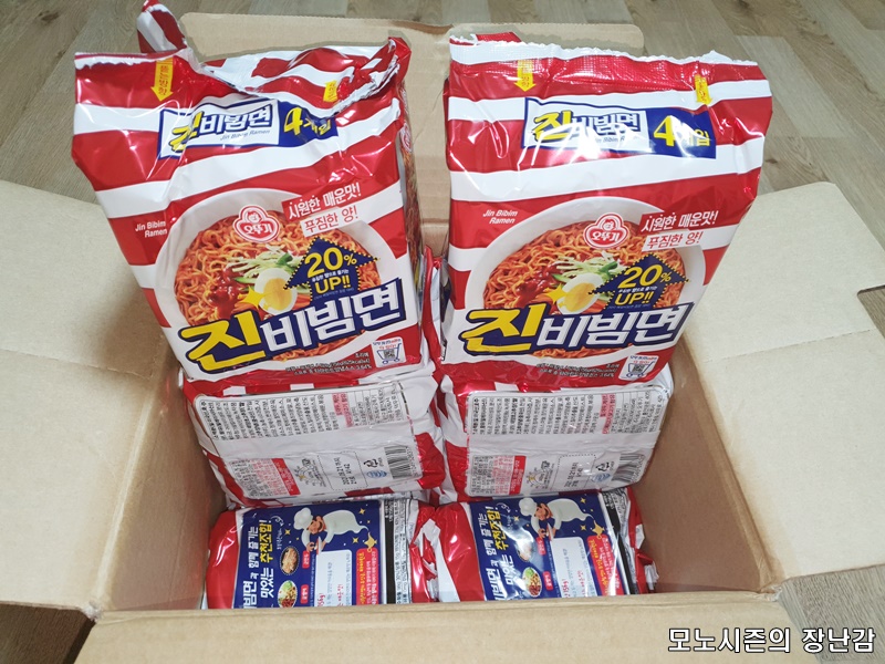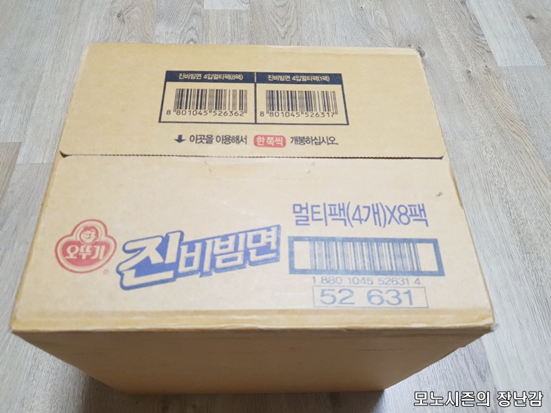 멀티팩이 1팩당 4개의 진비빔면이 들어 있고 이게 8개로 총 32개 구성에 인터넷쇼핑에서 16000원에 로켓배송으로 구매했고 택배로 다음날 도착했습니다.