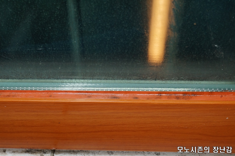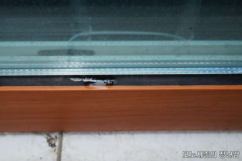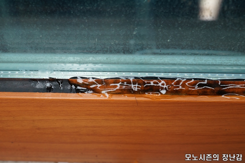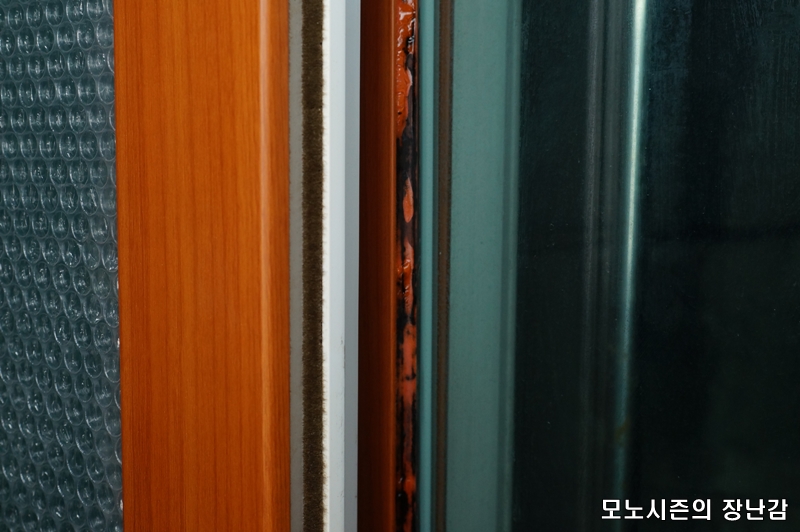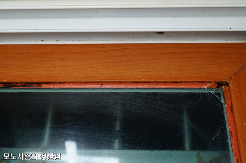 원래 갈색실리콘이 발라져 있는 창문인데 검정 곰팡이로 인해서 실리콘이 검정색이된 창문입니다.
