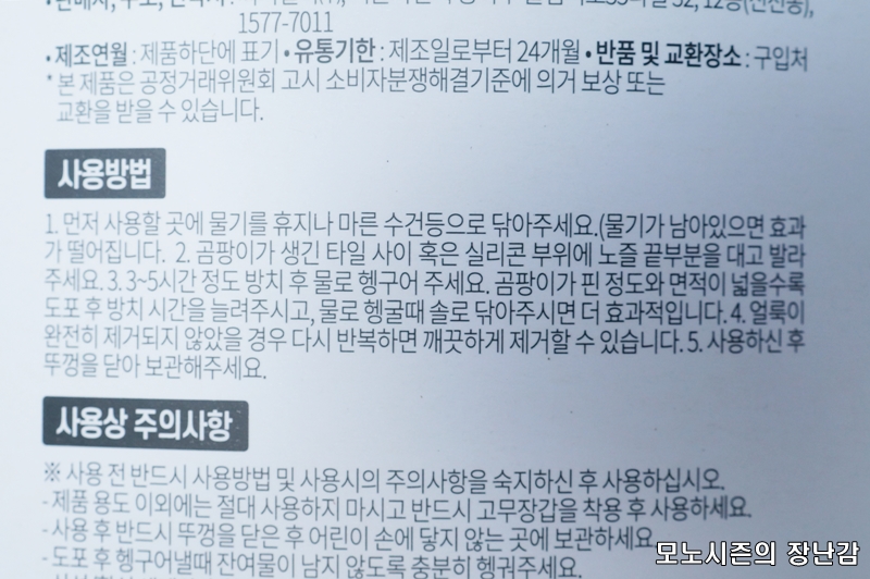 포장은 사진처럼 흰색박스에 튜브형 탐사 곰팡이 제거제가 들어 있는 형태이고, 특별한 점은 없습니다.