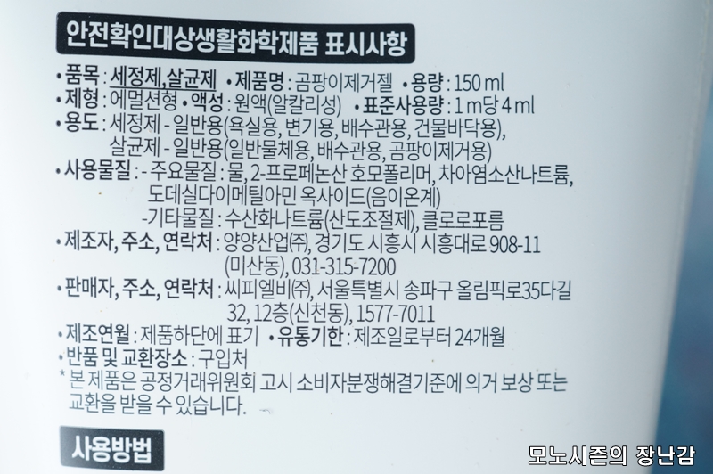 안전기능 확인 신고번호까지 있는 제품으로 나름 신경써서 만든 제품이며 다른 제품들도 마찬가지로 락스성분이 주로 사용되기 때문에 특유의 냄새는 줄인다고 줄여도 어쩔 수 없는 부분입니다.