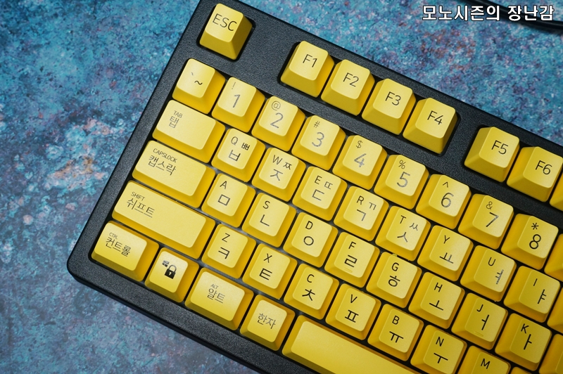 실리콘 키스킨은 대부분의 브랜드들이 사용하는 느낌의 제품이 사용되었지만, CPK-1의 옐로우키캡에 검정각인이 워낙 눈에 띄는 색상 조합이기 때문에 키스킨을 씌우고도 시인성 장난 아니게 좋습니다.