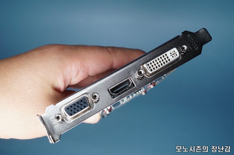 후면포트의 순서는 일반적인 저렴한 그래픽카드 배열순서와 동일하고 요즘 많이 사용하는 HDMI가 중앙에 있기 때문에 편리한 구성이라고 할 수 있고 사용율이 낮은 VGA포트가 슬롯 고정부 근처라서 케이스에 따라서는 간섭이 있을 수 있는 부분이라서 잘 구성되어 있는 것입니다.