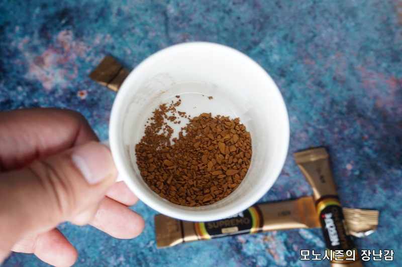 네스카페 수프리모 아메리카노 제품은 90g짜리 병포장 제품과 동일한 커피를 사용하기 때문에 동인한 입자를 보이며, 유명 커피믹스 브랜드들이 사용하는 커피입자와 동일한 입자입니다.