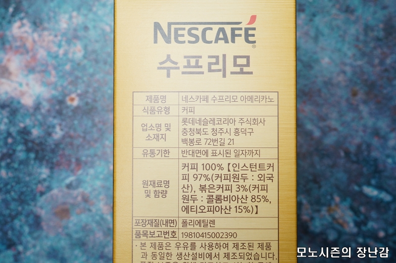 ※원재료 및 함량 : 커피 100%[인스턴트 커피 97%(커피원두 : 외국산), 볶은커피 3%(커피원두 : 콜롬비아산 85%, 에티오피아산 15%)]로 다른 인스턴트 카피 아메리카노 제품들처럼 여러 원산지의 커피가 블랜딩된 제품이기 때문에 네스카페만의 레시피로 만들어진 제품입니다.