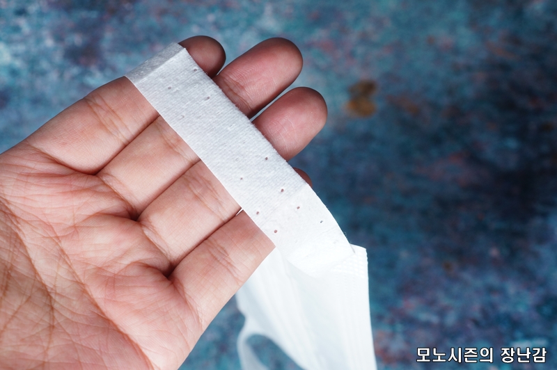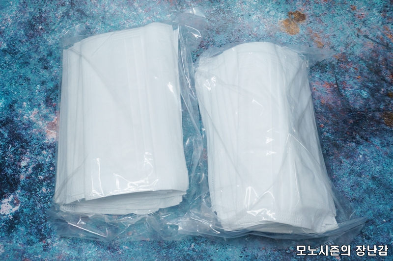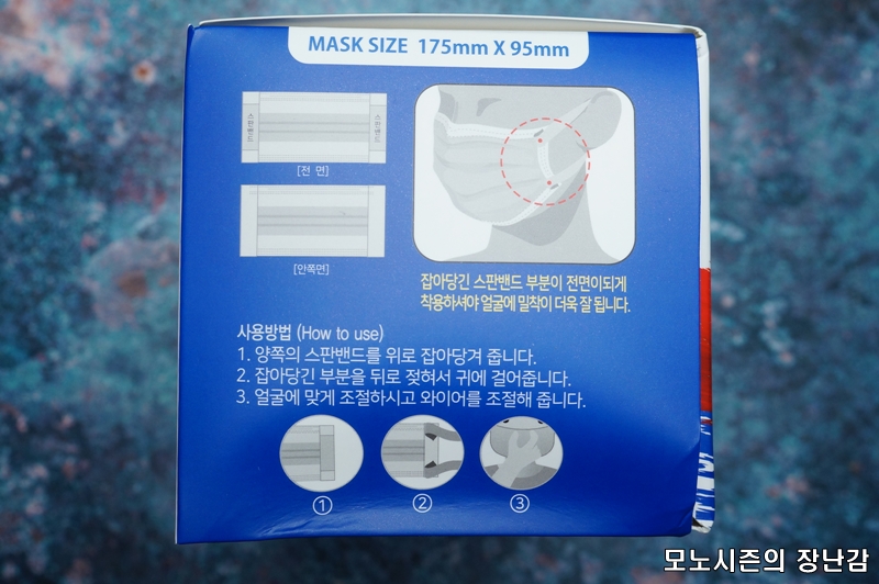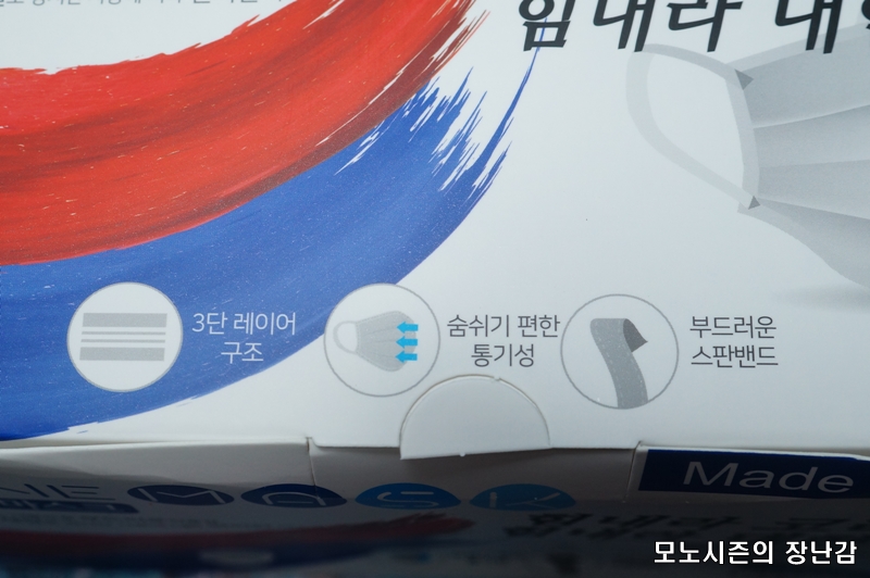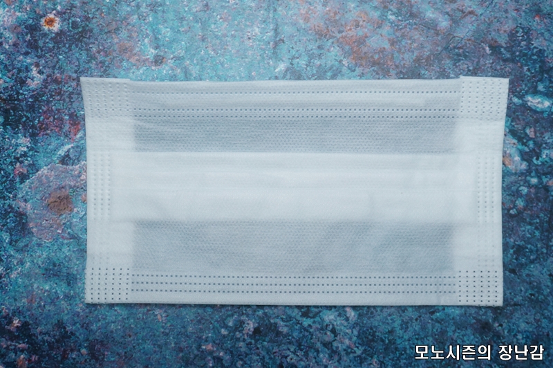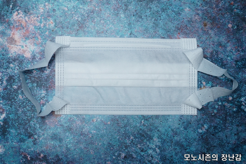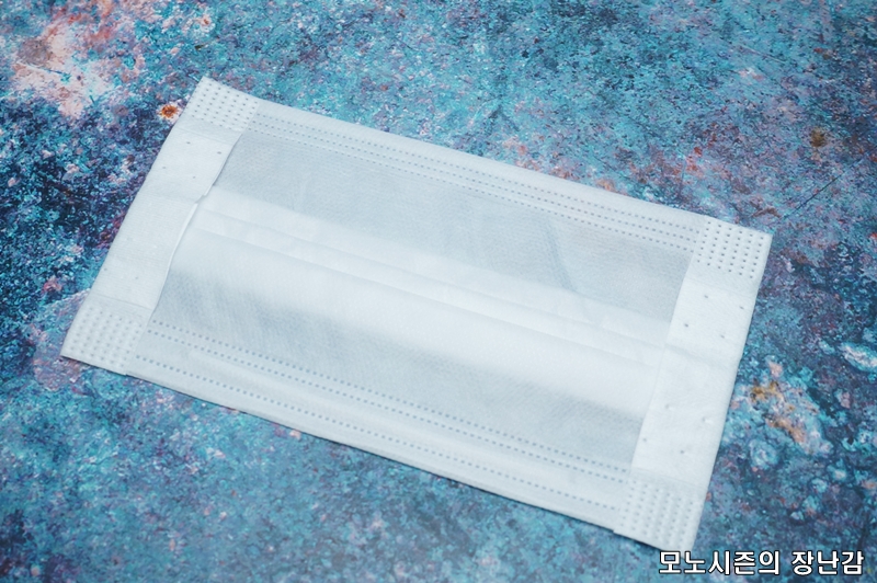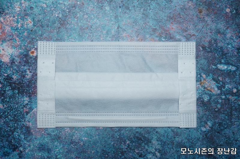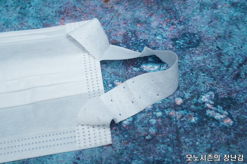 일반적인 위생마스크나 공산품 마스크처럼 3단 레이어 구조로 만들어진 제품이고 숨쉬기 편한 통기성을 가지고 있다고 되어 있으며 부드러운 스판밴드를 사용한다고 되어 있습니다.