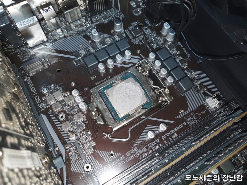 인텔 i5-10400F에 가운데 사진처럼 짜냈고 따로 펴바르지 않았습니다.