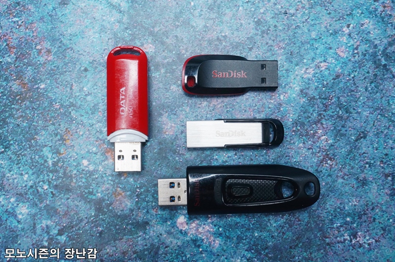 오른쪽 위의 샌디스크 제품은 구형 USB 2.0제품이고 나머지 제품들은 USB 3.0제품으로 빨간건 몇년째 사용중인 에이데이터 재품이고(뚜껑분실), 중간이 울트라 플레어 Z73이고 아래 제품이 풀사이즈 슬라이딩 제품인 Z48 제품입니다.