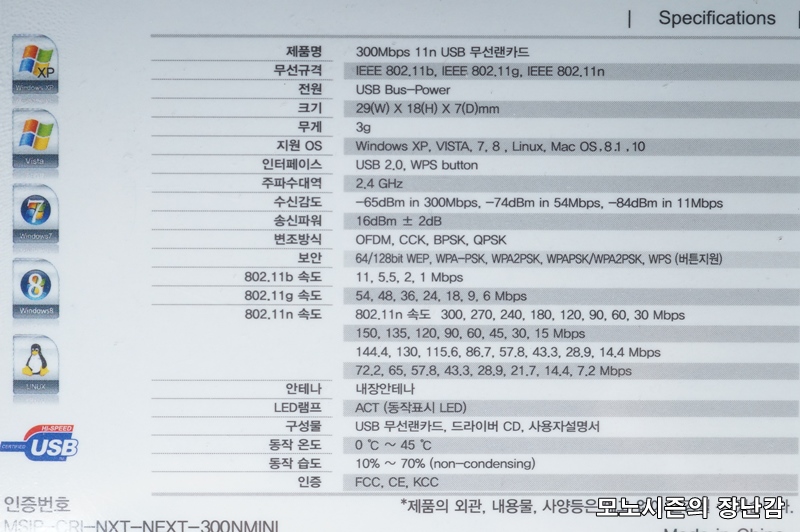 국내 정식 수입품이기 때문에 KC인증을 받은 제품이고, WPS기능도 내장되어 있기 때문에 공유기의 WPS연결 기능을 이용해서 간단하게 랜카드와 연결이 가능합니다만 대부분의 사용자들이 WPS기능은 안쓰긴 하지만 그래도 달려 있는 것은 장점입니다.