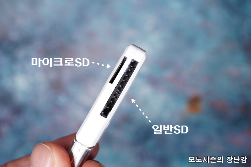 일반SD 슬롯과 마이크로SD카드 슬롯이 따로 있어서 별도의 젠더가 필요 없는 구성으로 대부분의 비슷한 가격대의 스틱형 메모리카드용 리더기의 구성과 비슷합니다.