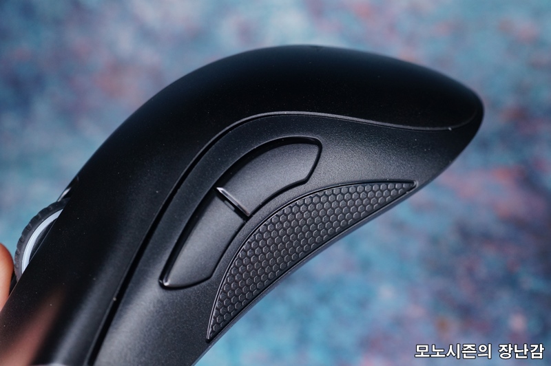 마우스의 양쪽 그립 부분에는 플라스틱으로 무늬를 만들어서 미끄러짐을 방지하고 상판의 플라스틱도 표면처리가 미세해서 미끄러짐이 거의 없습니다.