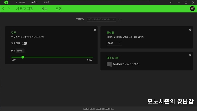 따로 DPI변경키는 없지만 DPI단계 설정도 가능한데 개인적으로 FHD기준으로 1000DPI를 선호하기 때문에 1000DPI고정이고 폴링레이트도 1000hz설정이며 이 마우스의 최대 가속도는 30G로 동일 가격대 제품증에서 높은 편이기 때문에 빠르게 화면이 움직이는 FPS게임에 유리한 제품입니다.