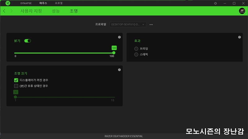 최신 RGB로 여러색상의 LED를 표현할 수는 없고 레이저 특유의 그린색상 LED만 지원되며, 스크린샷처럼 밝기와 깜빡임 정도만 조절이 가능합니다.