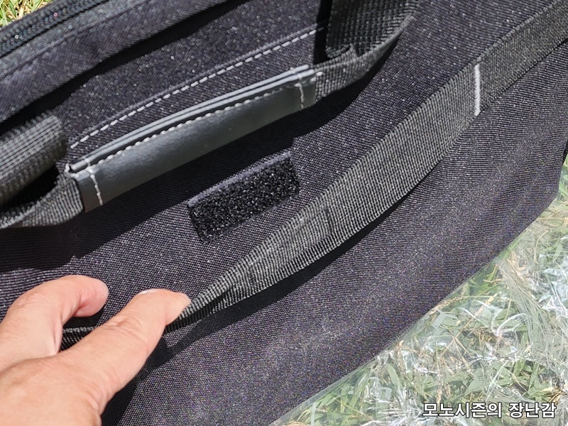 대부분의 노트북 가방과 동일하게 캐리어에 끼울 수 있는 끈 부분이 존재하고 끈이 흐느적 거리지 않게 벨크로 찍찍이로 붙어 있는 형상으로 신경써서 만든 가방임을 알 수 있습니다.