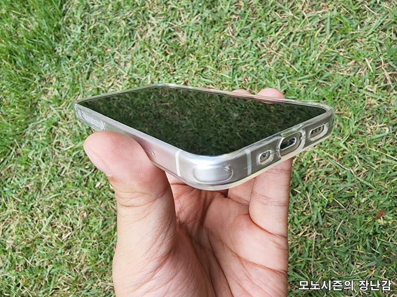 아이폰 12미니용은 여태까지 구매했던 안드로이드용과는 다르게 4군데 구석에 에어쿠션층으로 보이는 구조가 내장되어 있다는게 아이폰 12미니용 누아트 울트라씬 케이스의 특징입니다.