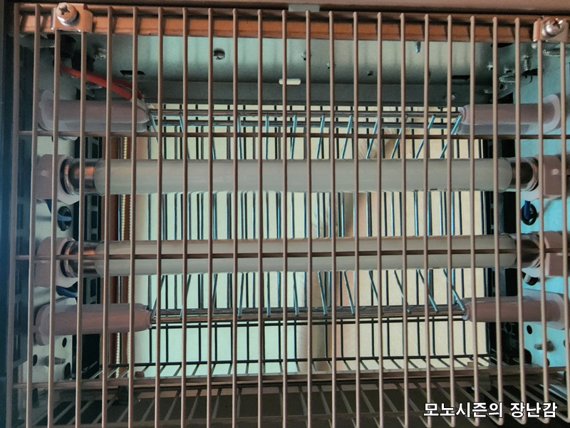 외부 안전철망 안에 램프쪽으로 감전철사가 있고 청소를 염두하고 만든 것 같기는 한데 철사가 두껍기 때문에 벌레가 들러붙어서 지저분해지는 현상이 적은 타입입니다.