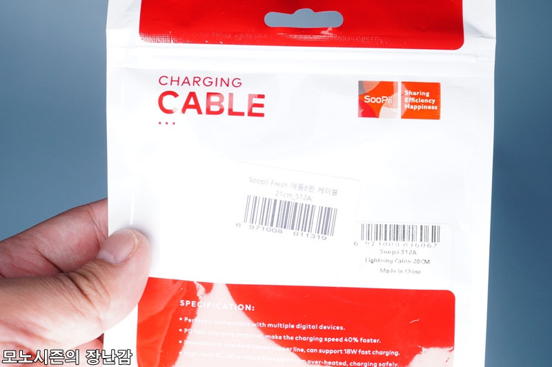 멜로디코리아에서 판매하는 고속충전 케이블 브랜드인 Soopii로 판매중인 애플 8핀 라이트닝 케이블 중에서 제일 짧은 사이즈가 21cm제품인데요. 이번에 구매한 제품이 보조배터리에 사용할 생각으로 구매한 S12A모델입니다.